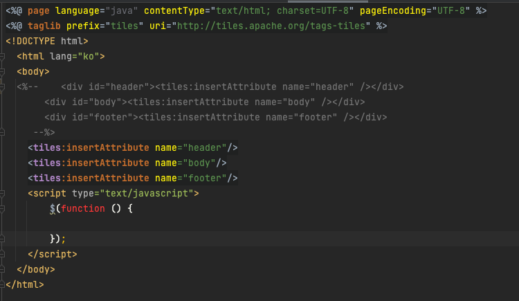 여기에 tiles 네임지정한것들을 넣어주면 그 네임에 지정된주소 jsp를 가지고 저 자리에 들어감